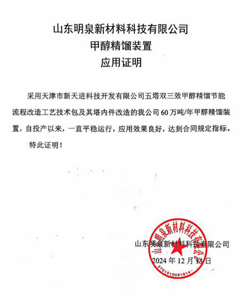 山东明泉新材料科技有限公司60万吨/年甲醇装置采用瑞士卡萨利(Casale)IMC甲醇合成工艺,于2015年6月开工建设,2017年7月建成。甲醇精馏工艺采用“3+1”工艺,精醇蒸汽单耗在1.05吨,与先进精馏工艺单耗相比,还存在一定的差距。2024年采用天津市新天进科技开发有限公司自主知识产权工艺技术——五塔双三效甲醇精馏工艺方法进行节能改造后,蒸汽单耗大幅降低至0.68吨蒸汽/吨精甲醇,产品质量满足GB338-2011国标优等品、并且乙醇含量降至20ppm以下。